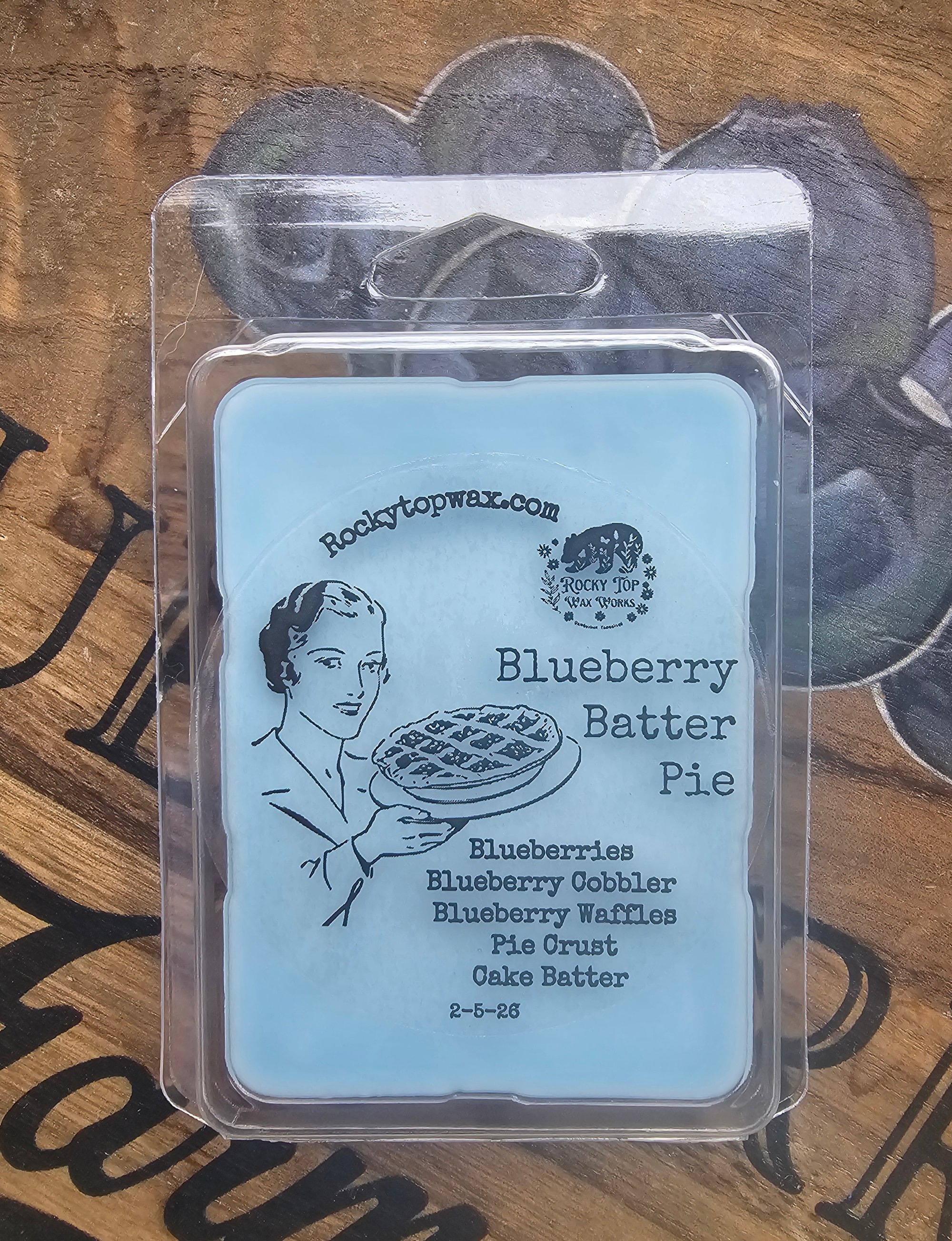 Blueberries, blueberry cobbler, blueberry waffles, pie crust and cake batter. A Rocky Top Wax Works exclusive custom houseblend fragrance
