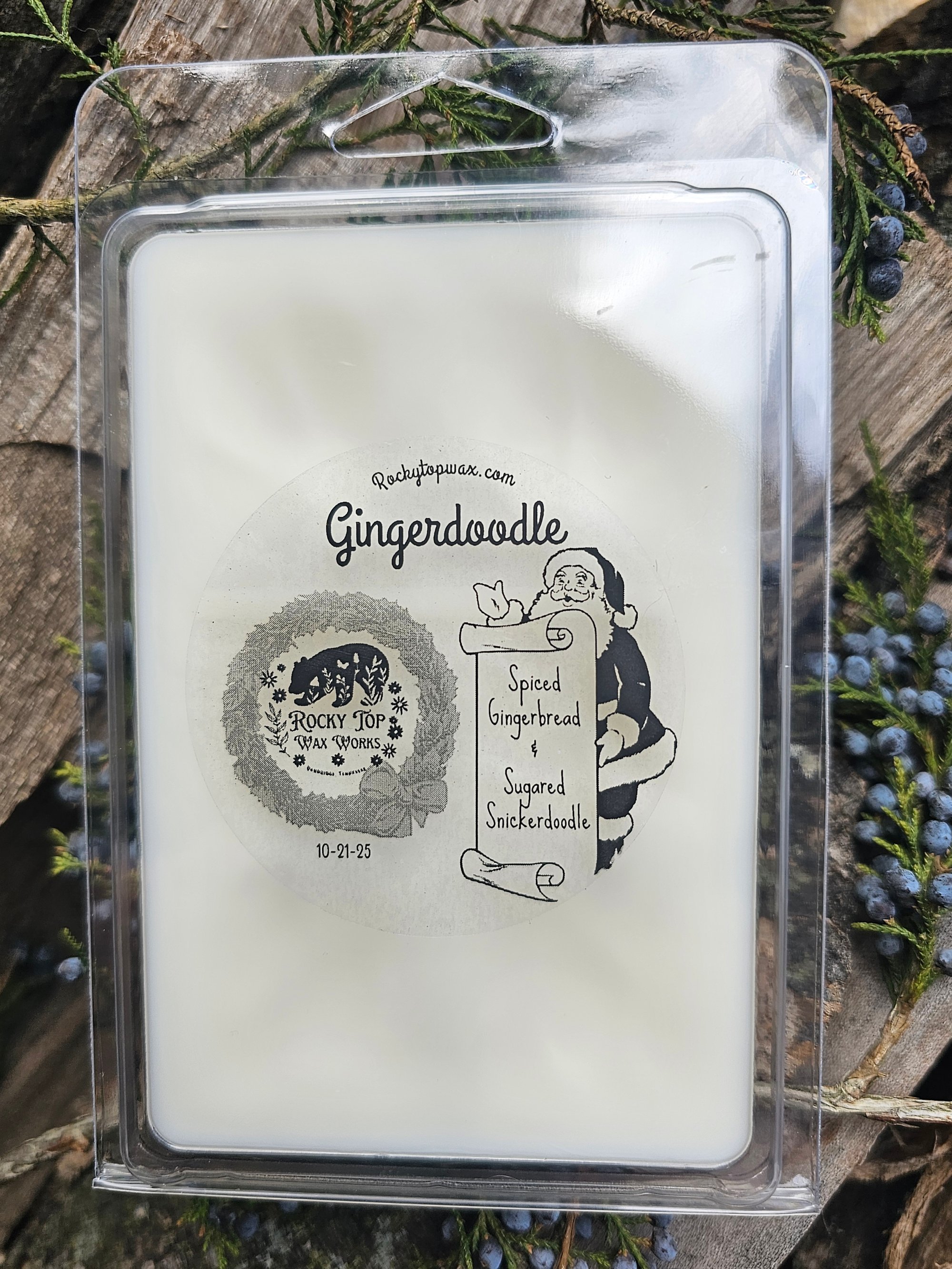 Gingerdoodle is a Rockytop Wax Works exclusive custom houseblend fragrance consisting of spiced gingerbread and sugared snickerdoodle