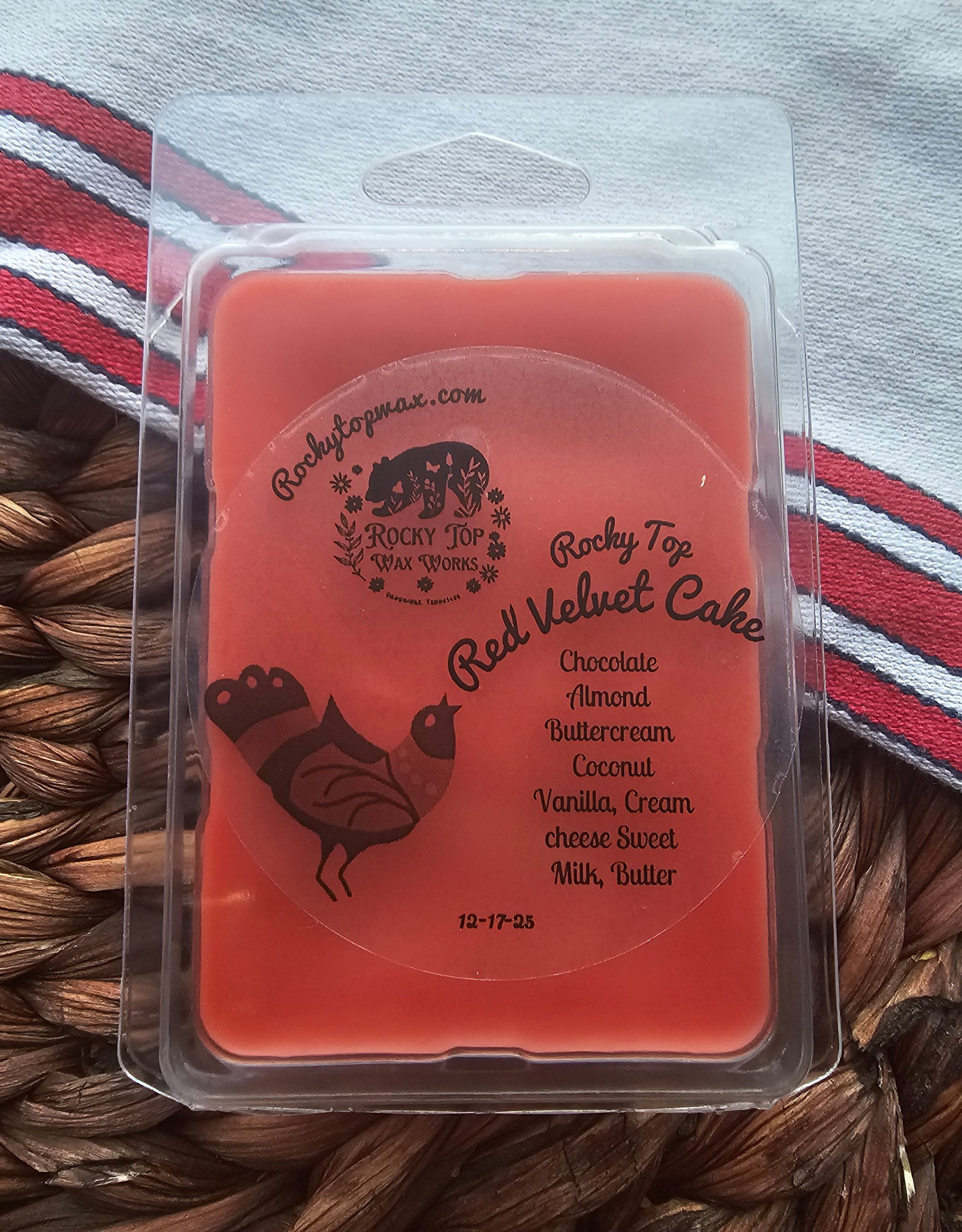 Smells just like a delicious Red Velvet cake with cream cheese icing. Chocolate, almond, Buttercream, coconut, vanilla, cream cheese, sweet milk, butter. A Rocky Top Wax Works exclusive custom houseblend fragrance