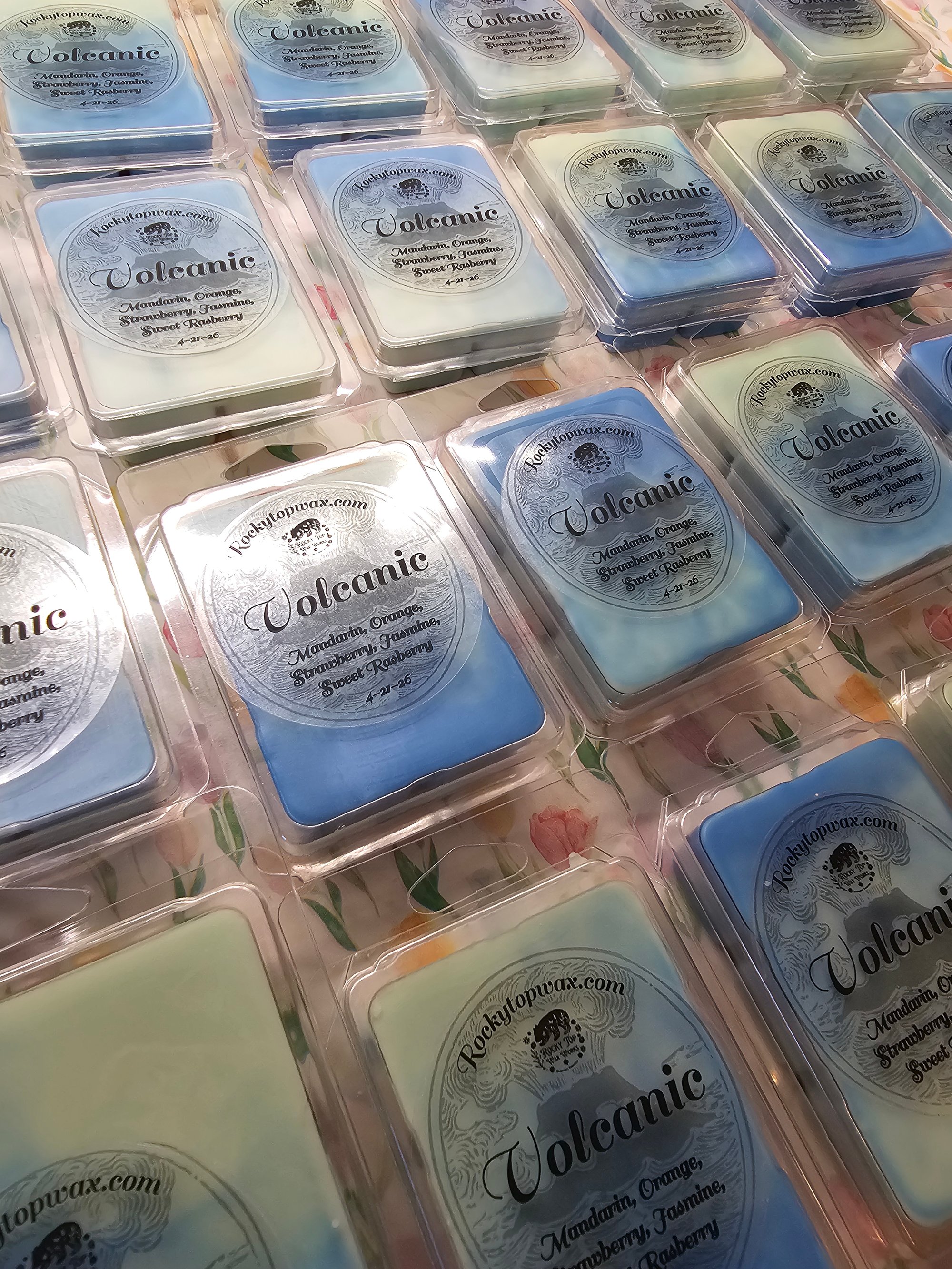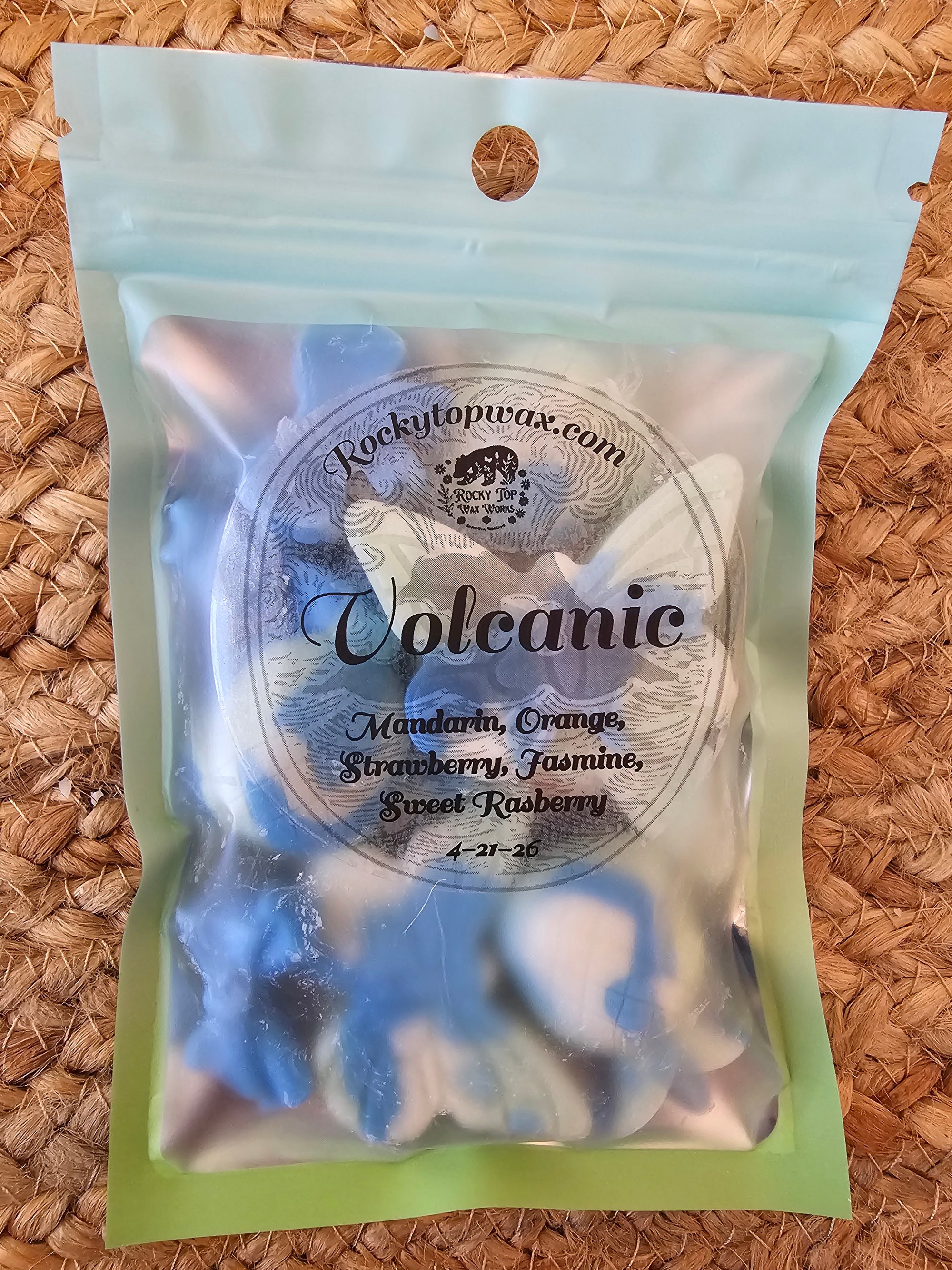 Volcanic is Mandarin, Orange, strawberry, jasmine, sweet raspberry. Its a dupe of cap. Blu. Volcano snd very similar to Scentsy Blue Grotto as well